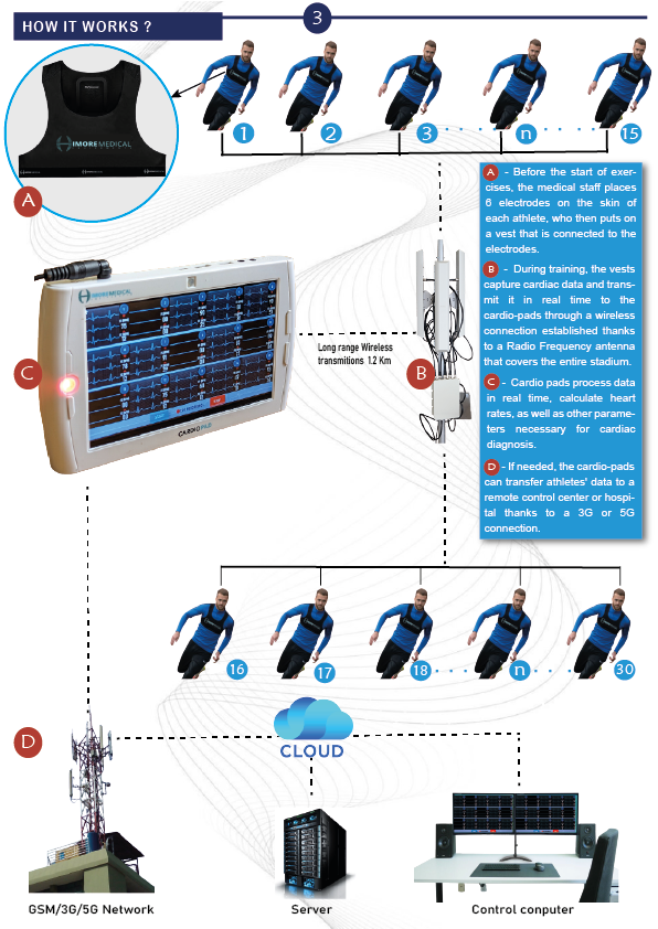 2- The Cardio-Pad processes the cardiac signal and transmits it in