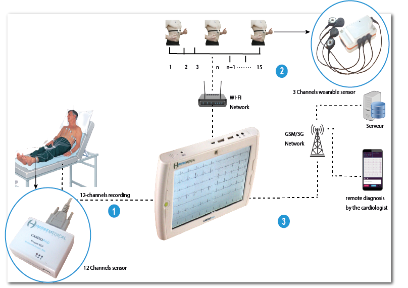 3 - The tablet transmits ECG data via GSM to the cardiologist, for a