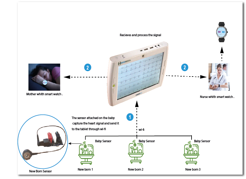 1- A nurse attachs 3 electrodes of the new born sensor on the skin
